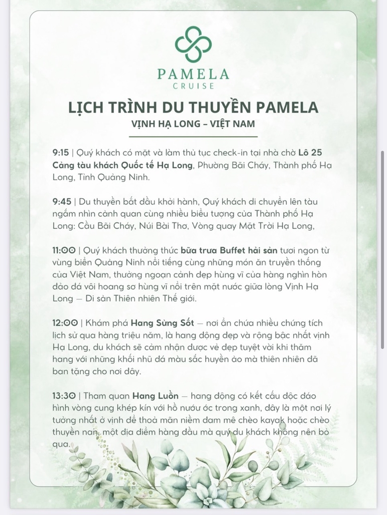 Pamela cruise đưa du khách đến các điểm tham quan nổi tiếng tại Hạ Long như đảo Ti Tốp, hang Sửng Sốt, và nhiều trải nghiệm hấp dẫn như: trèo thuyền kayak hoặc đi đò nan, tham gia tiệc trà chiều hoàng hôn, cùng nhiều dịch vụ thú vị khác. Hay cùng Onevivu khám phá tour du thuyền này nhé !!!